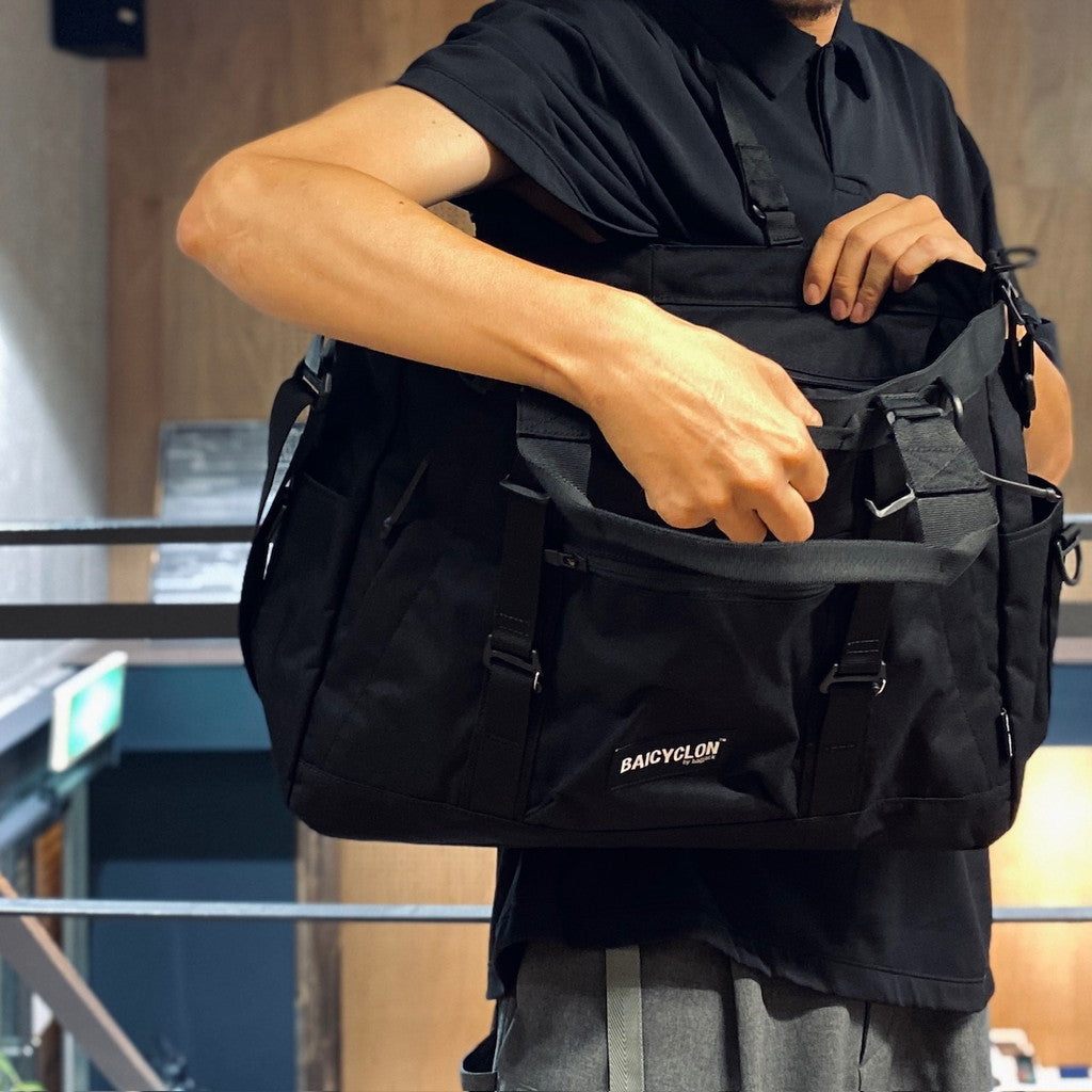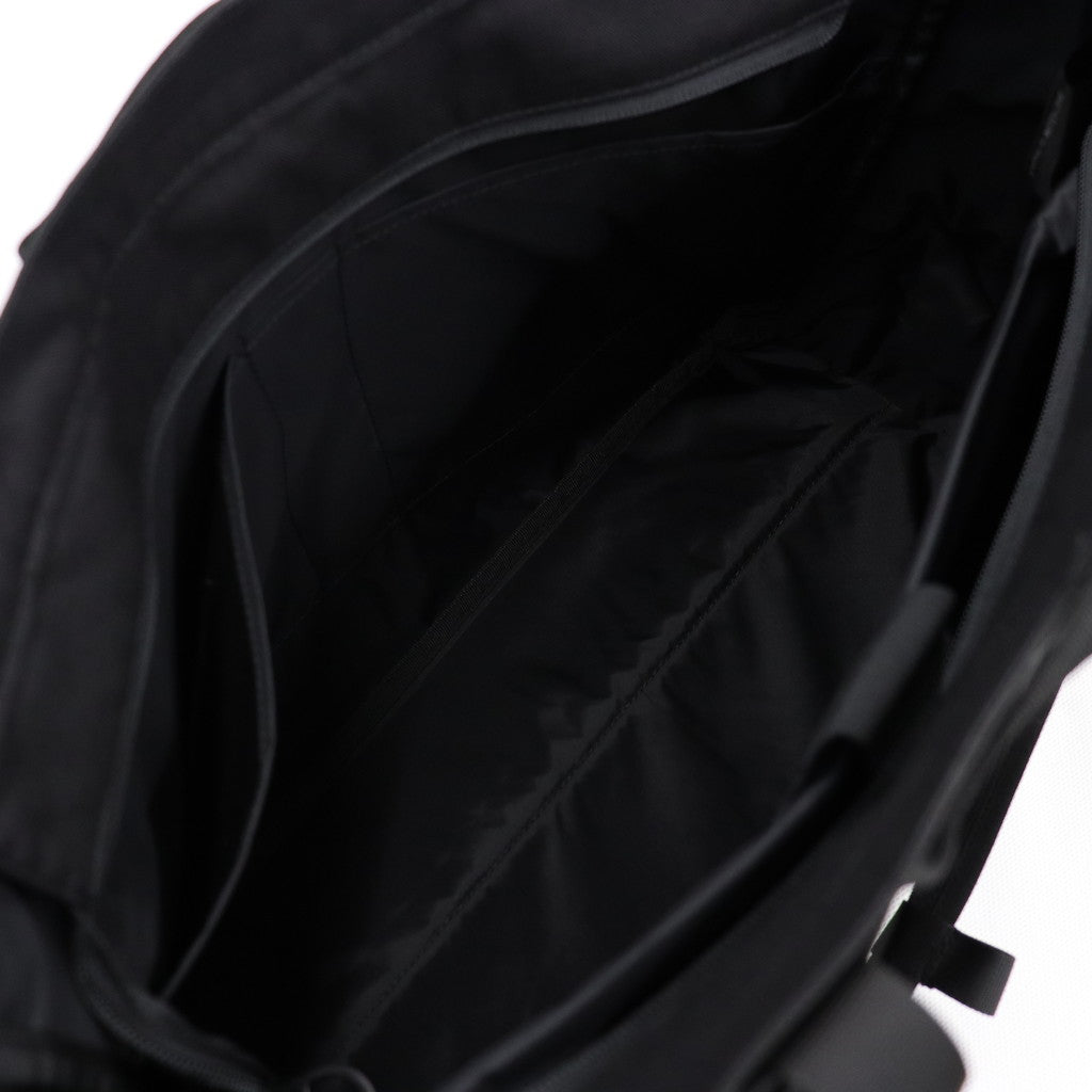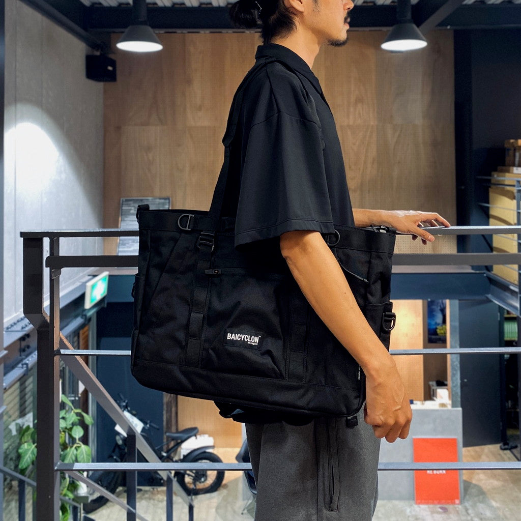 This tote bag features functional gear elements such as D-rings, hooks, and adjustable straps that will appeal to men.