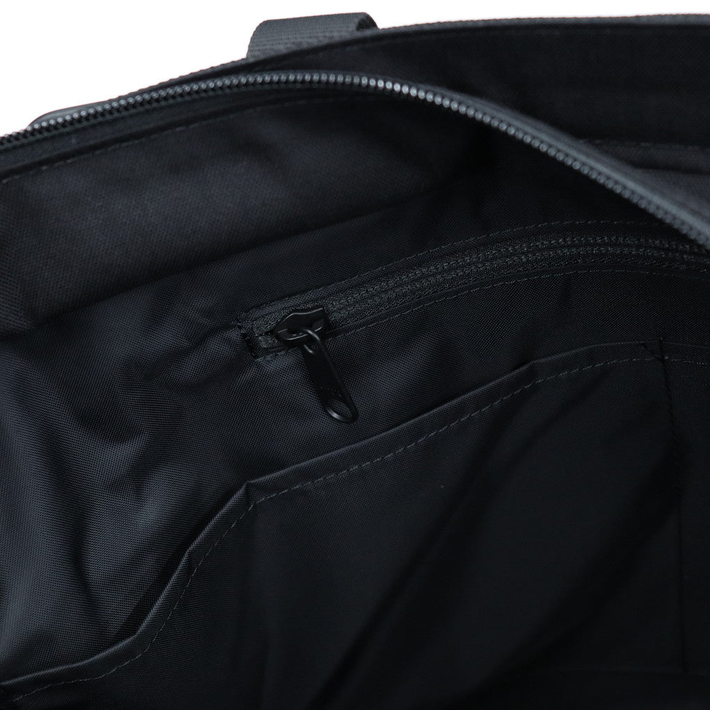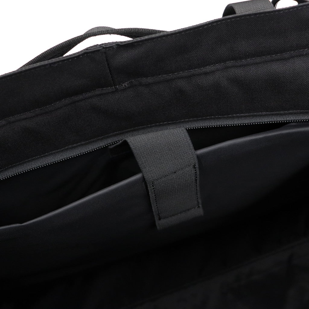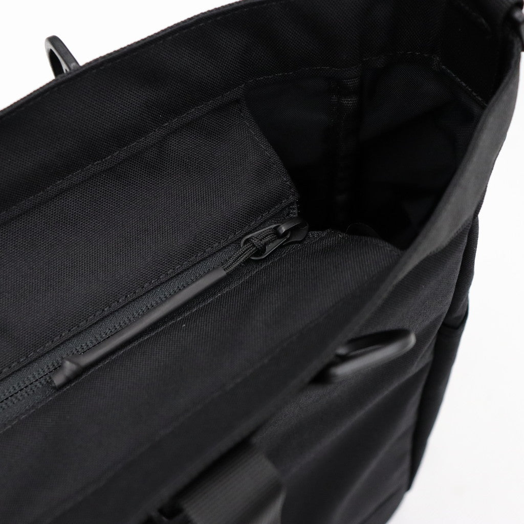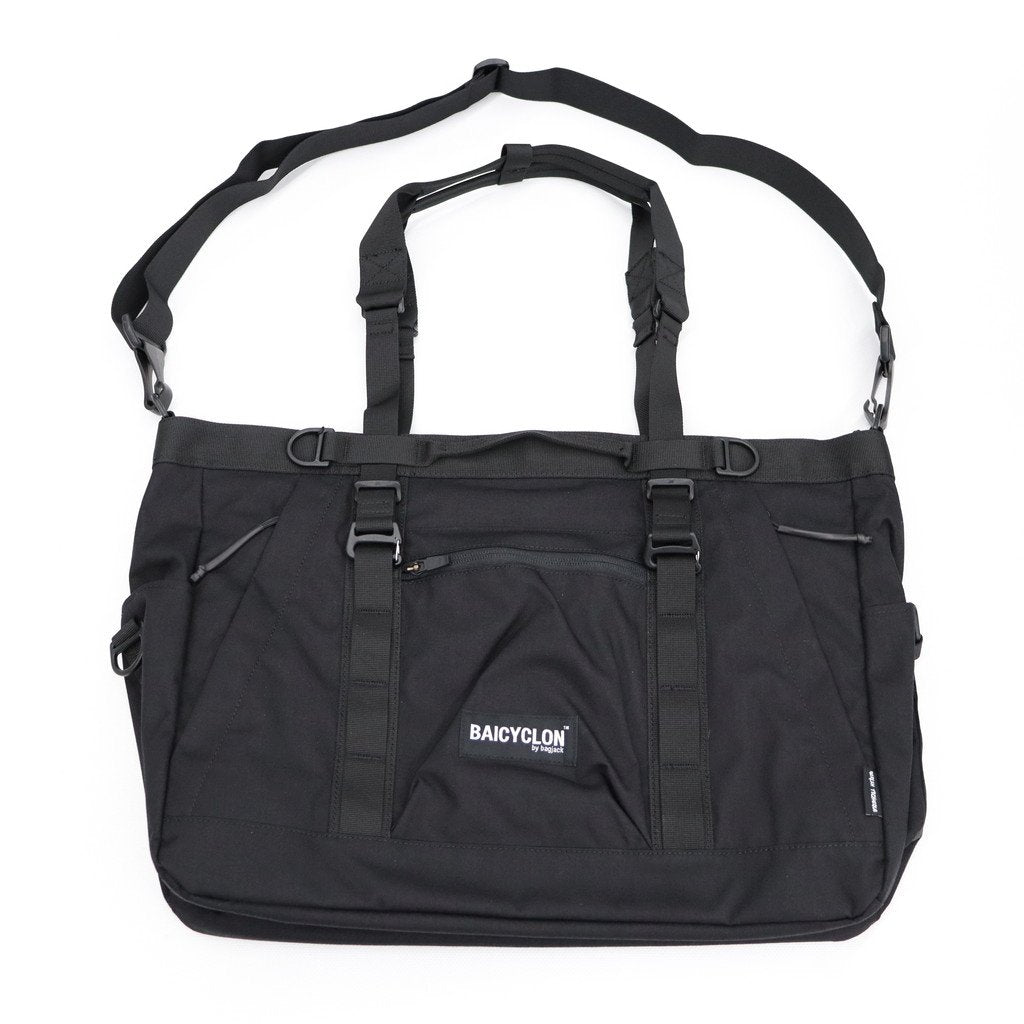 This tote bag features functional gear elements such as D-rings, hooks, and adjustable straps that will appeal to men.