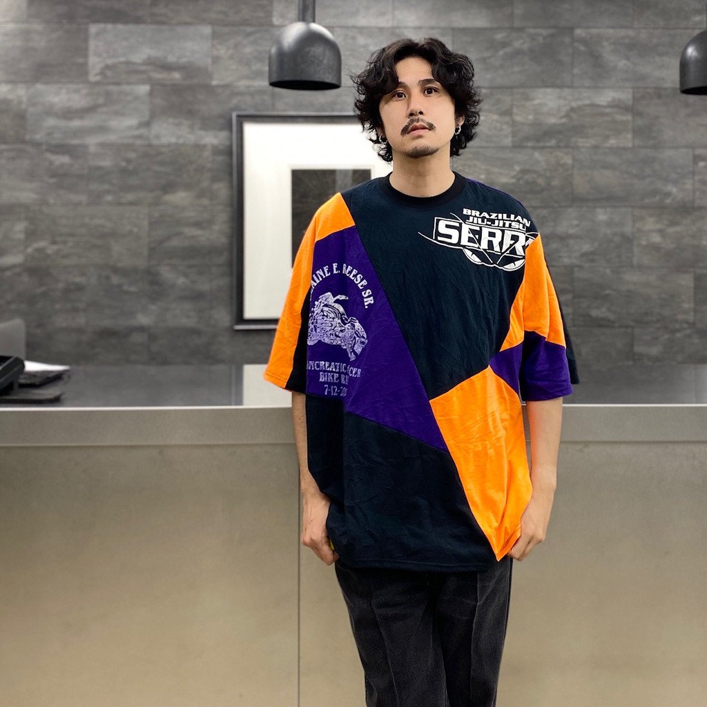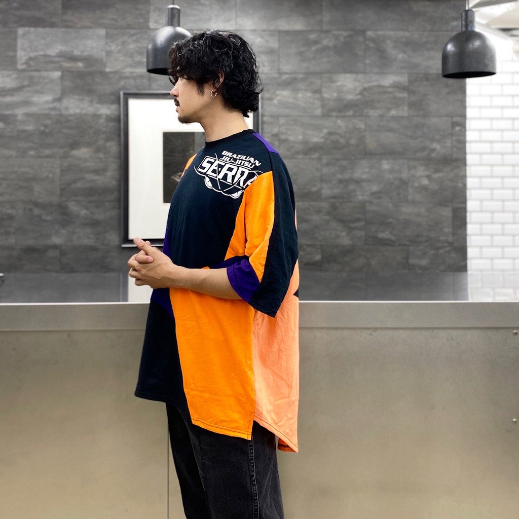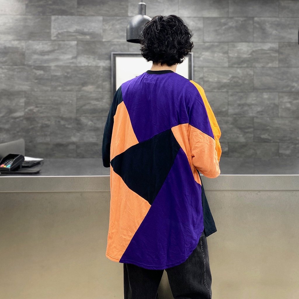 プリントと随所に見られるパッチワークが特徴で、全体的にゆとりを持たせたオーバーサイズのシルエット。後ろ身頃がラウンドカットの仕様になっています。