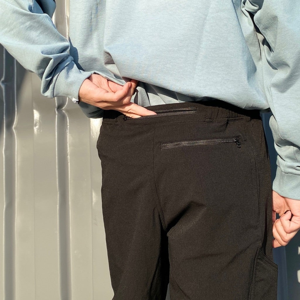 ウエストゴム仕様と2WAYストレッチの伸縮性のある素材を使用したリラックスウェア。