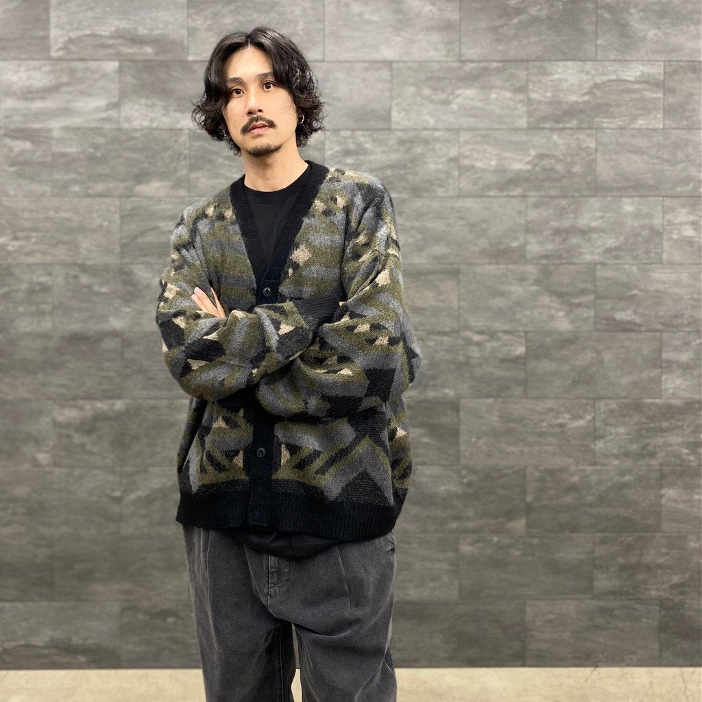 アメリカ先住民族のナバホ柄をイメージしたオリジナルグラフィック、EVIJO柄(エビホ)を編み上げたモヘアカーディガン。