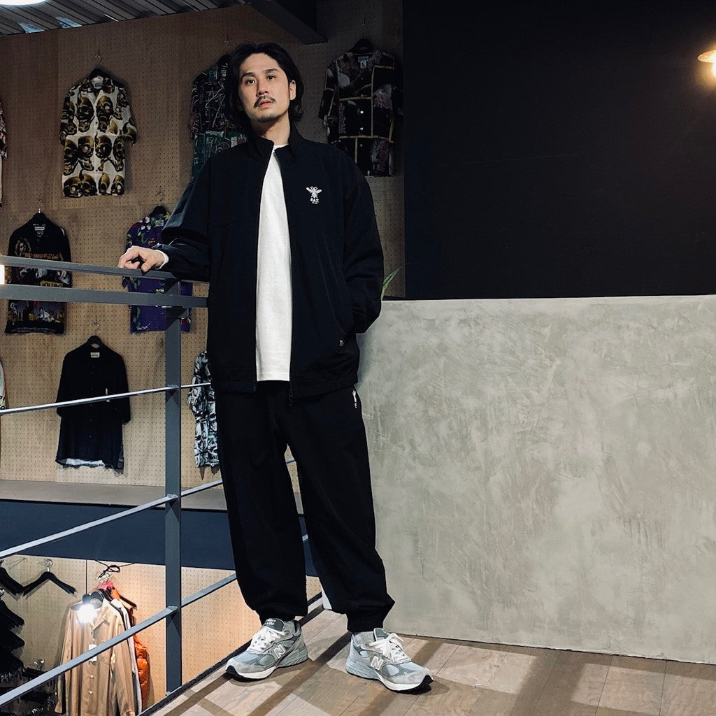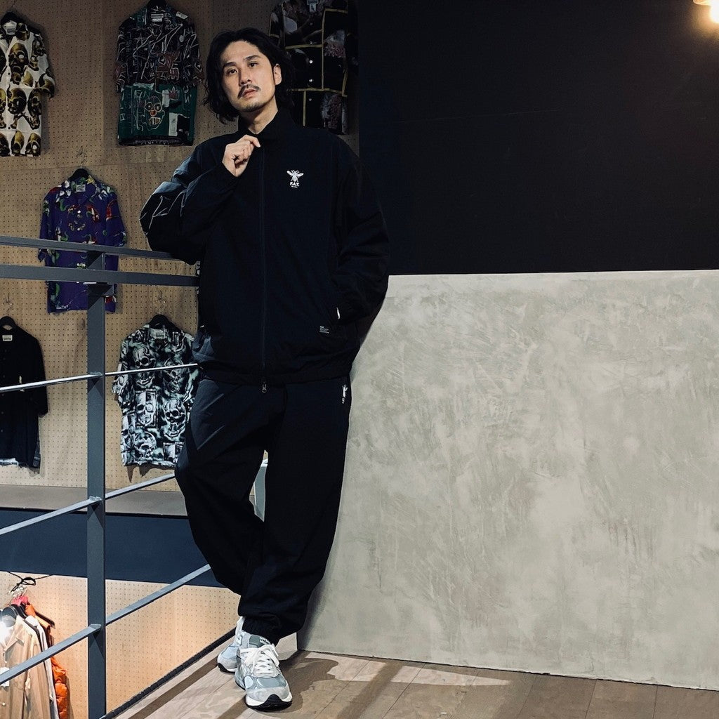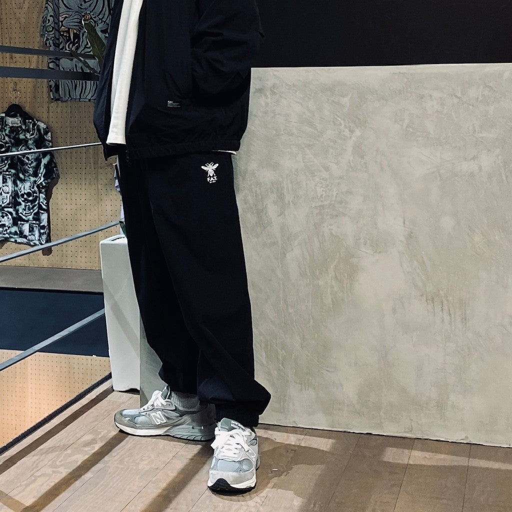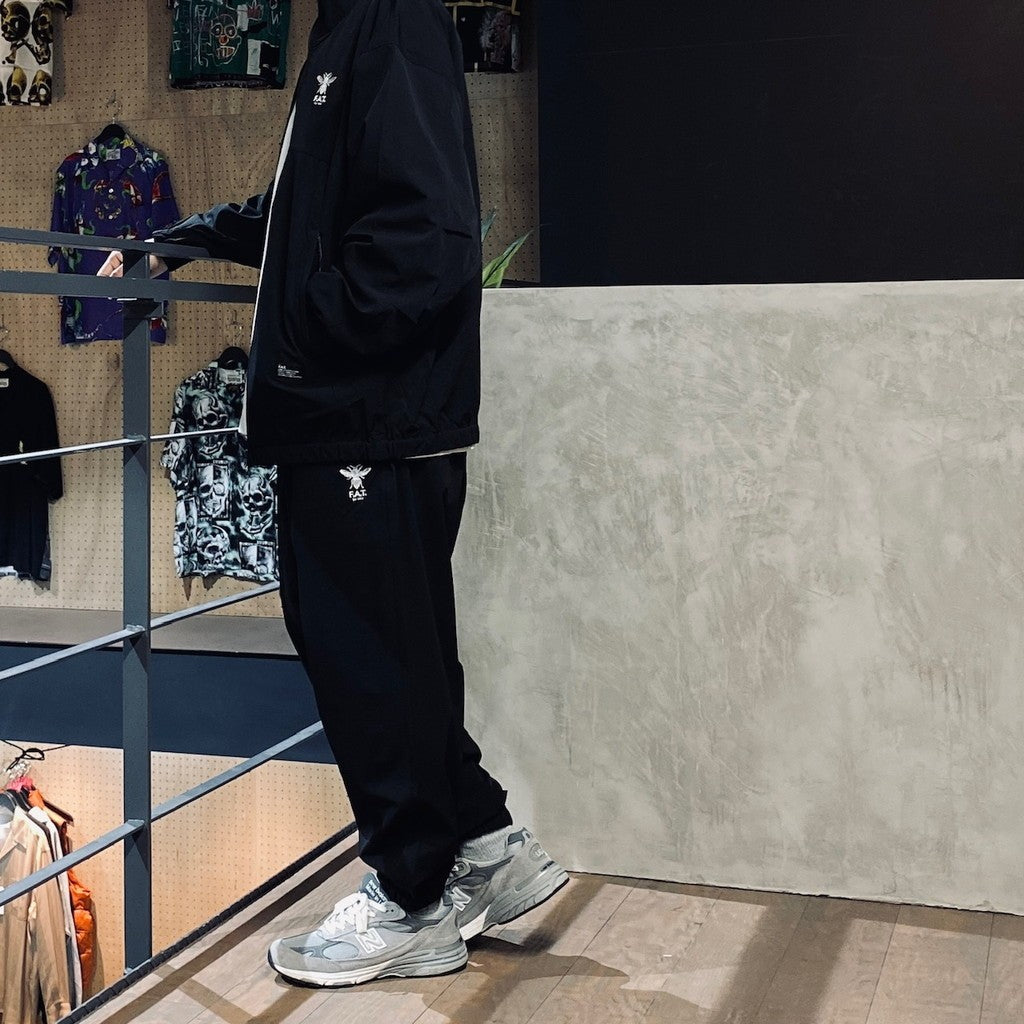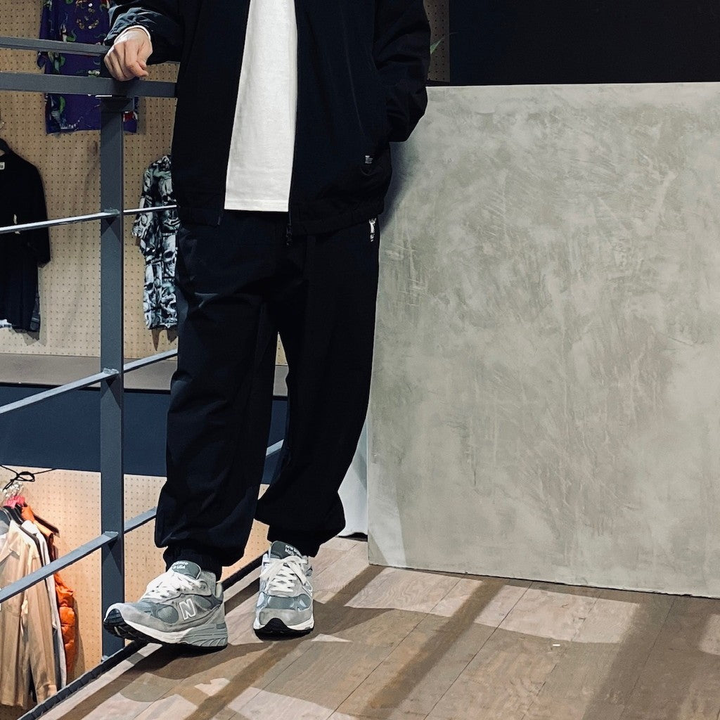 伸縮性の高いストレッチナイロン素材を使用したトラックパンツ。