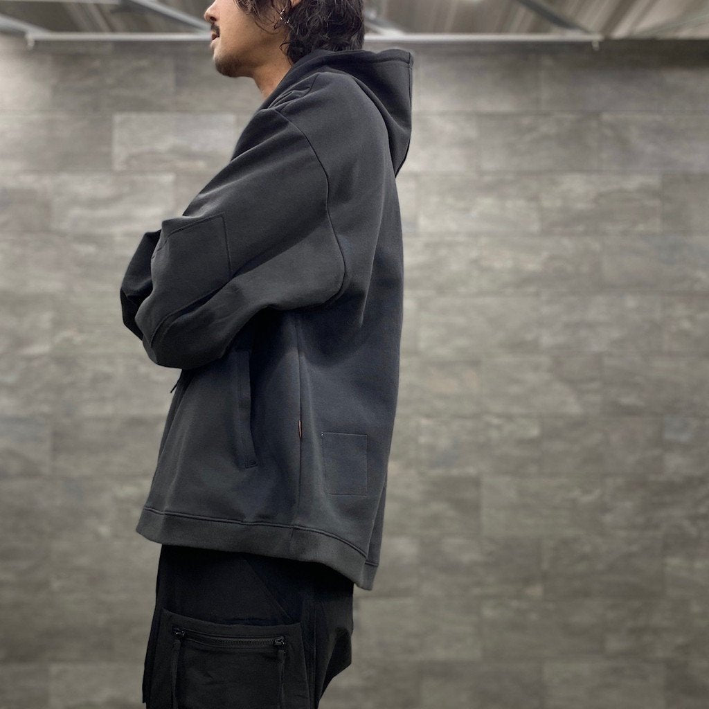 裾は緩めのリブを配置し、前と後ろの着丈を変えることで横からの見た目も意識したシルエットバランスが保たれています。