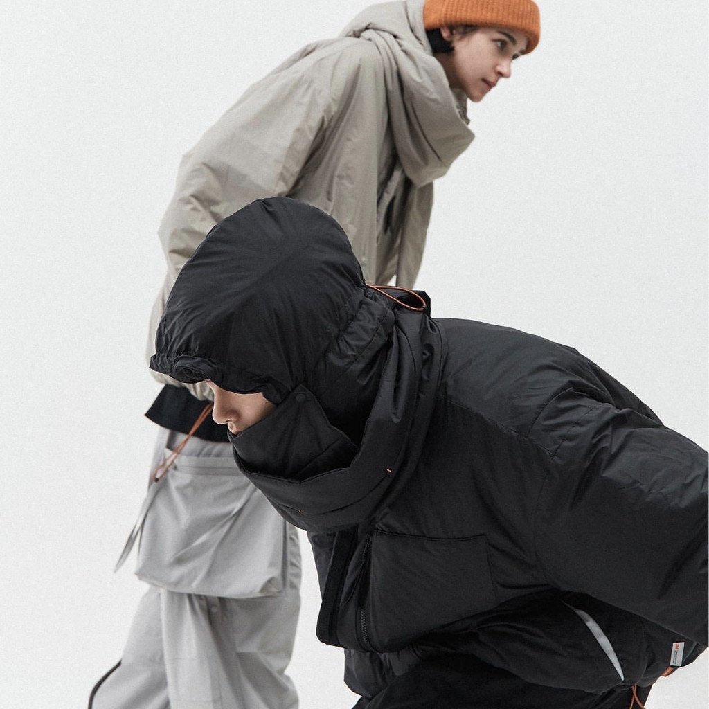 大きめなフードと裾にリフレクティブのオレンジコードを搭載。