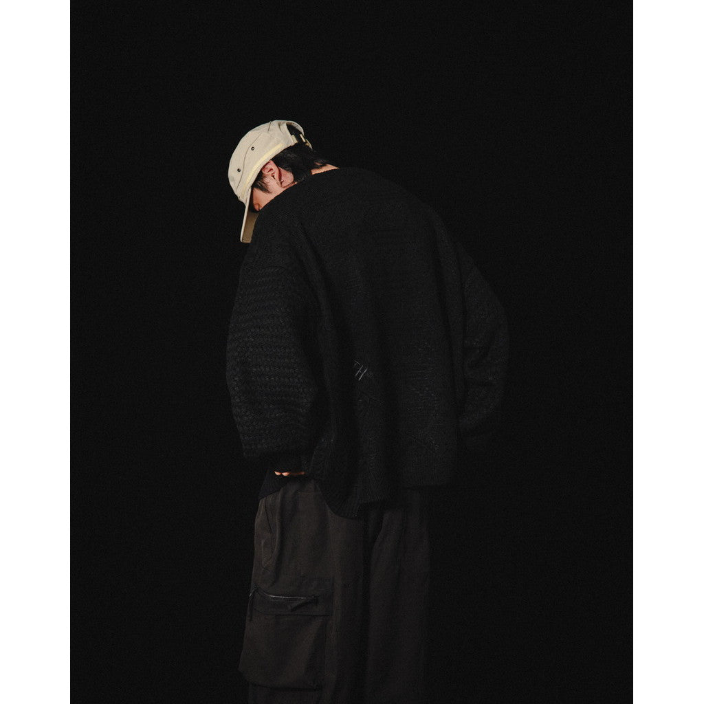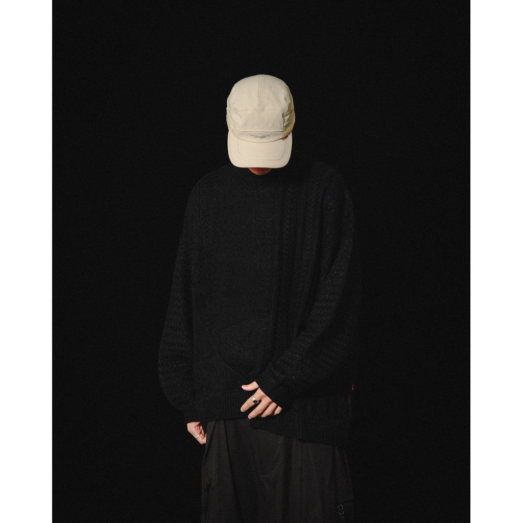 身頃には不規則な星型アイレットとアローツイスト、袖はハニカムツイスト、裾は幅の違うジャカードリブなど、5つの異なる編み地を組み合わせ、前身頃は短く、後ろ身頃はやや長く、裾はアシンメトリーなスプライシング(割れ目)を入れたユニークなデザインが特徴。