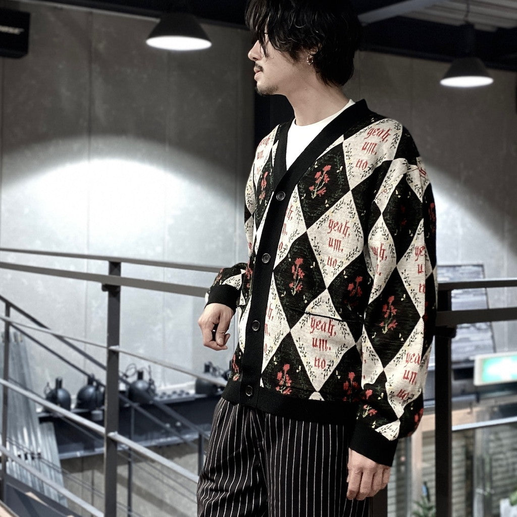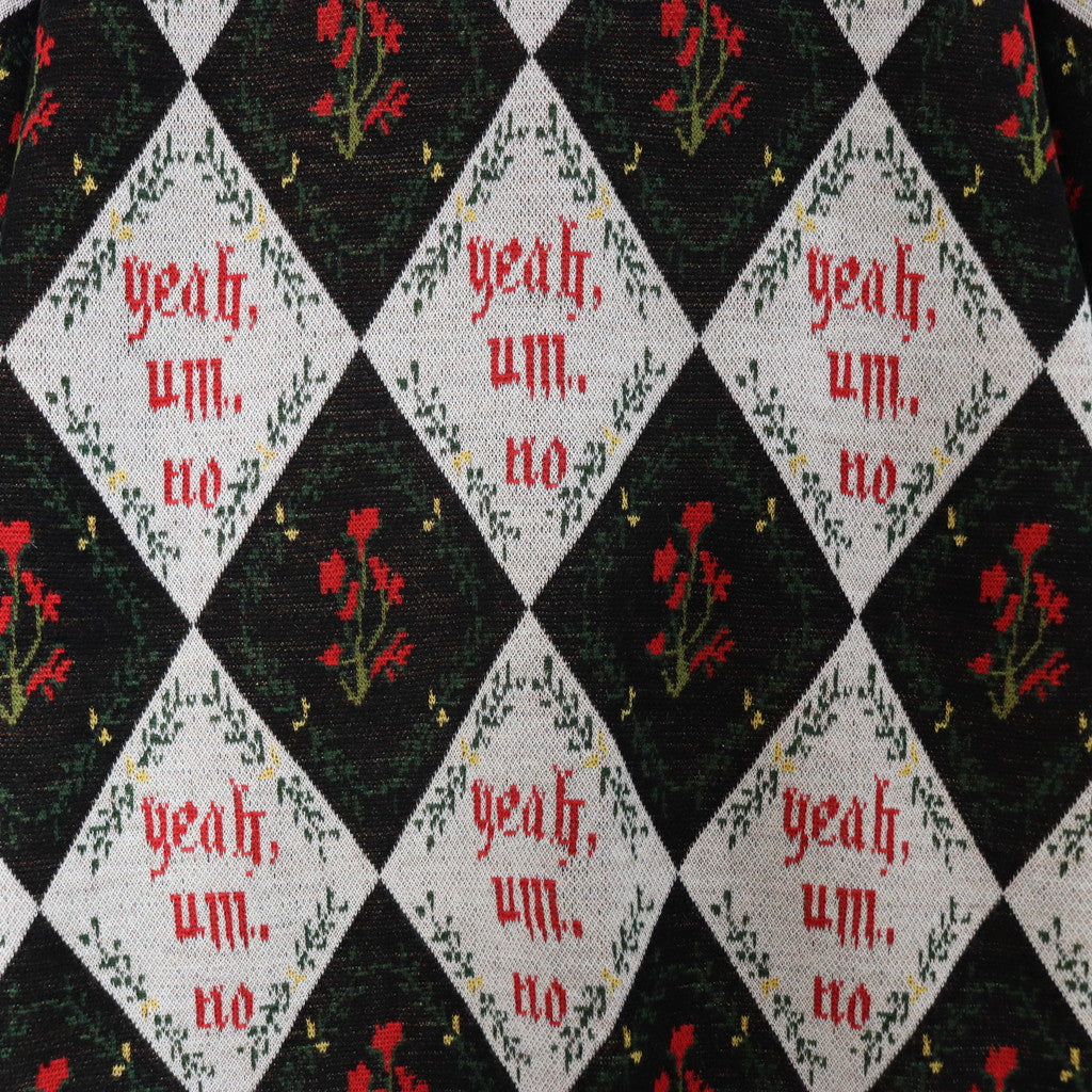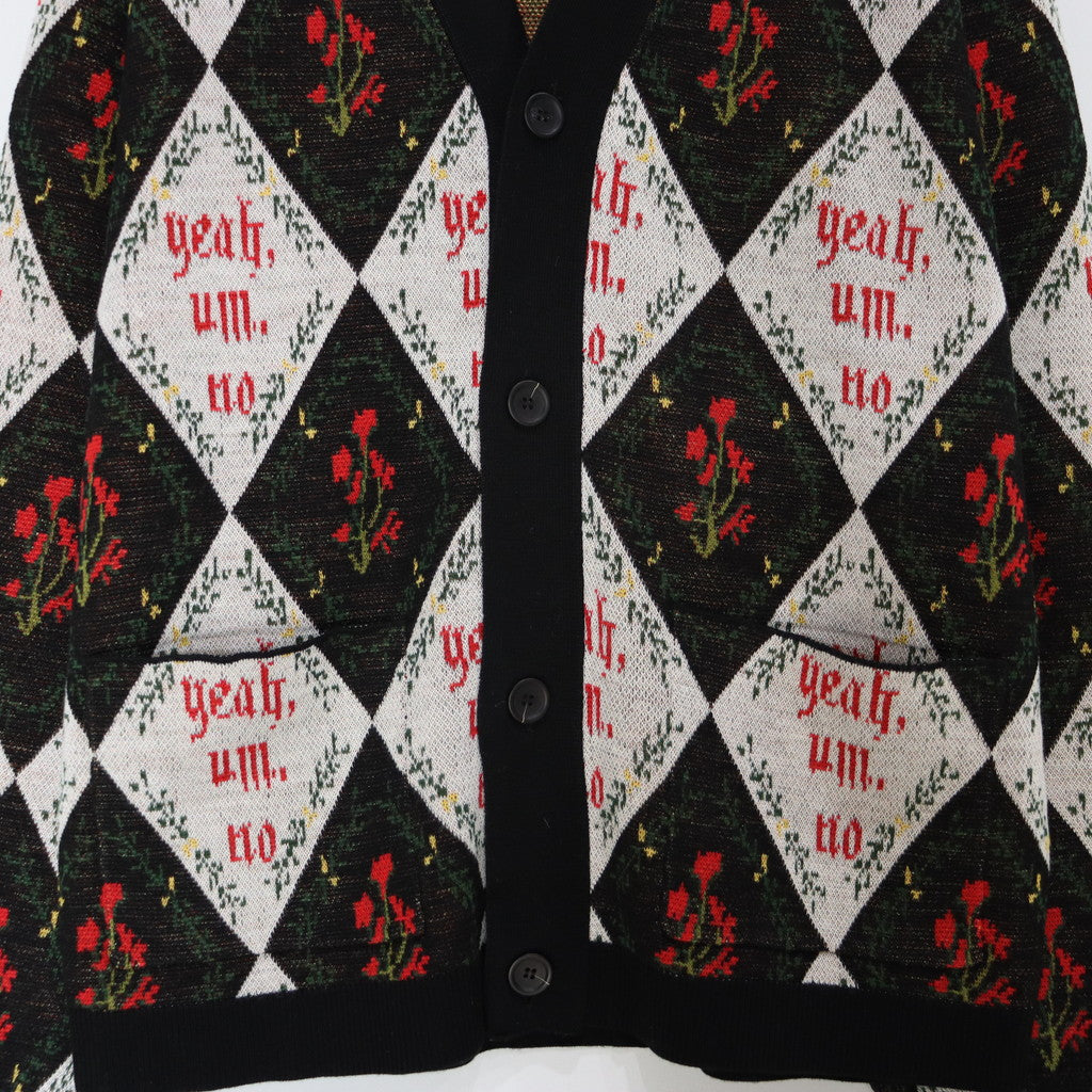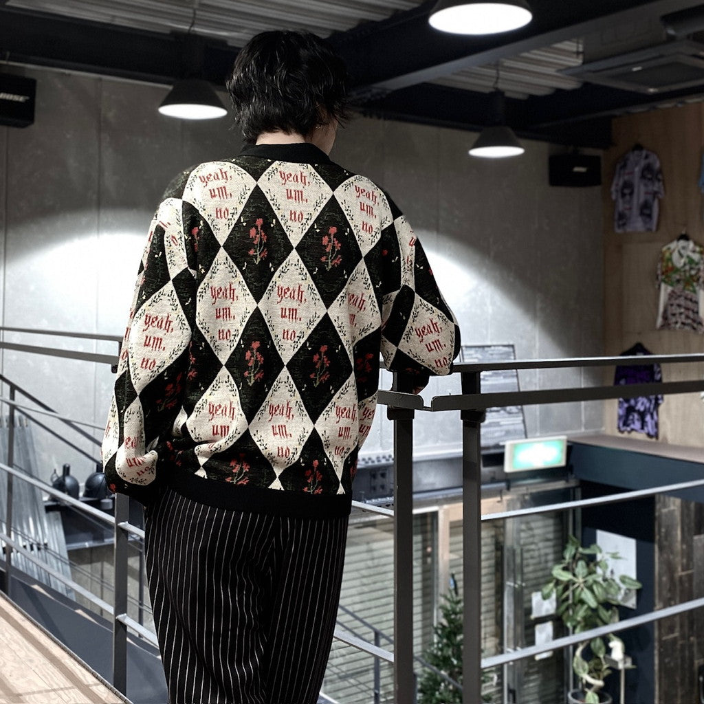 「Yeah,um,no」のメッセージを全体にレイアウトしたジャガードカーディガン。