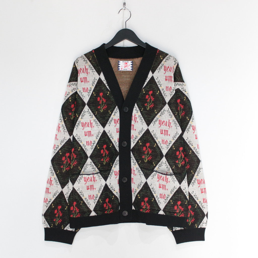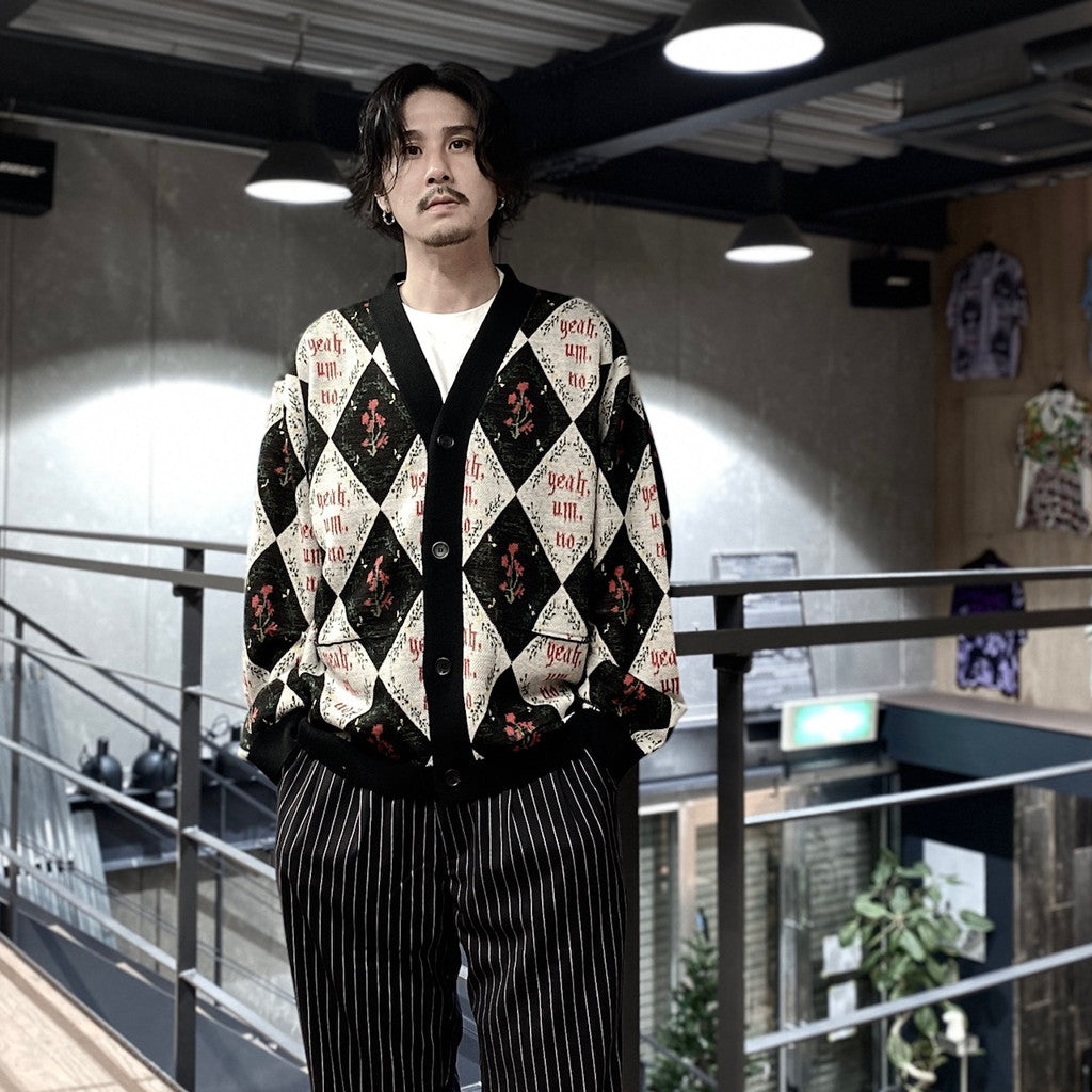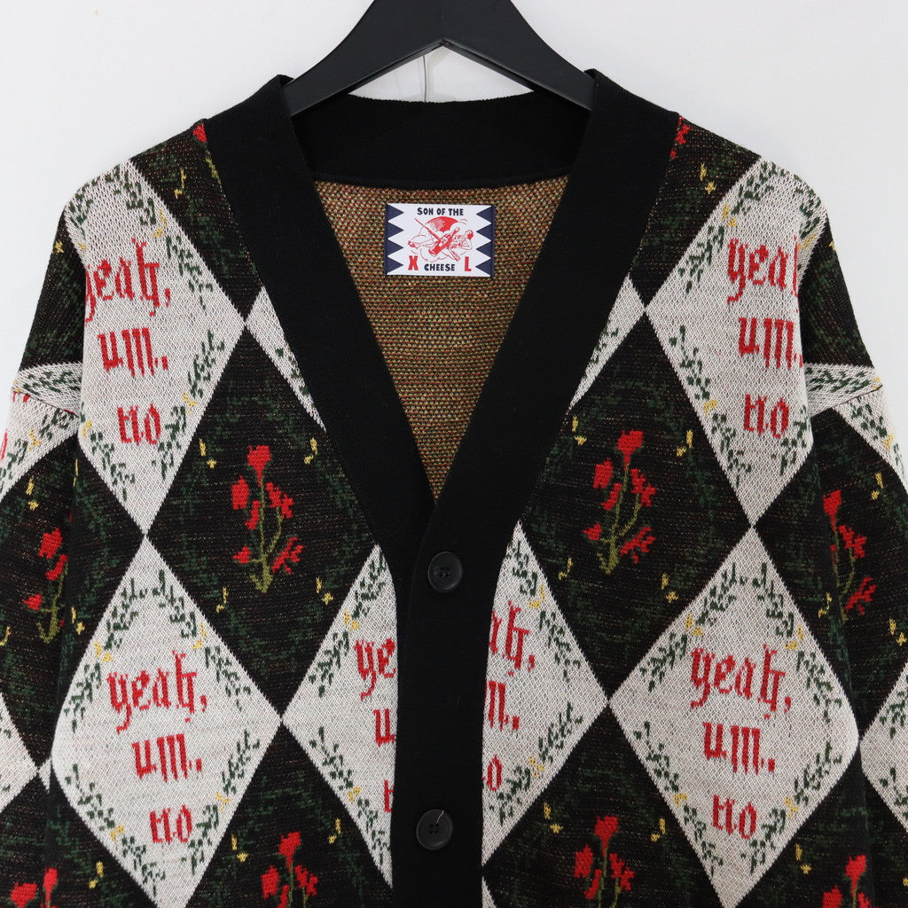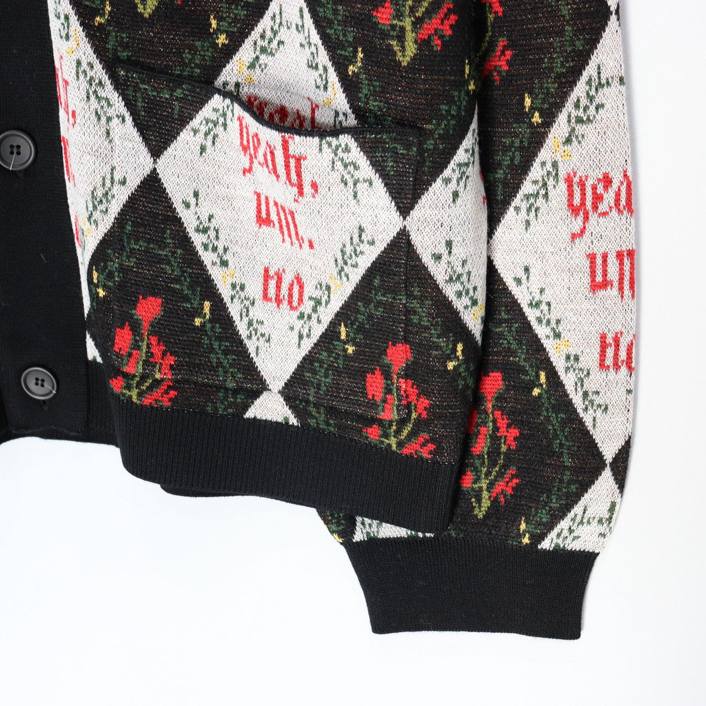 「Yeah,um,no」のメッセージを全体にレイアウトしたジャガードカーディガン。