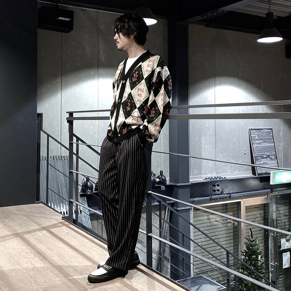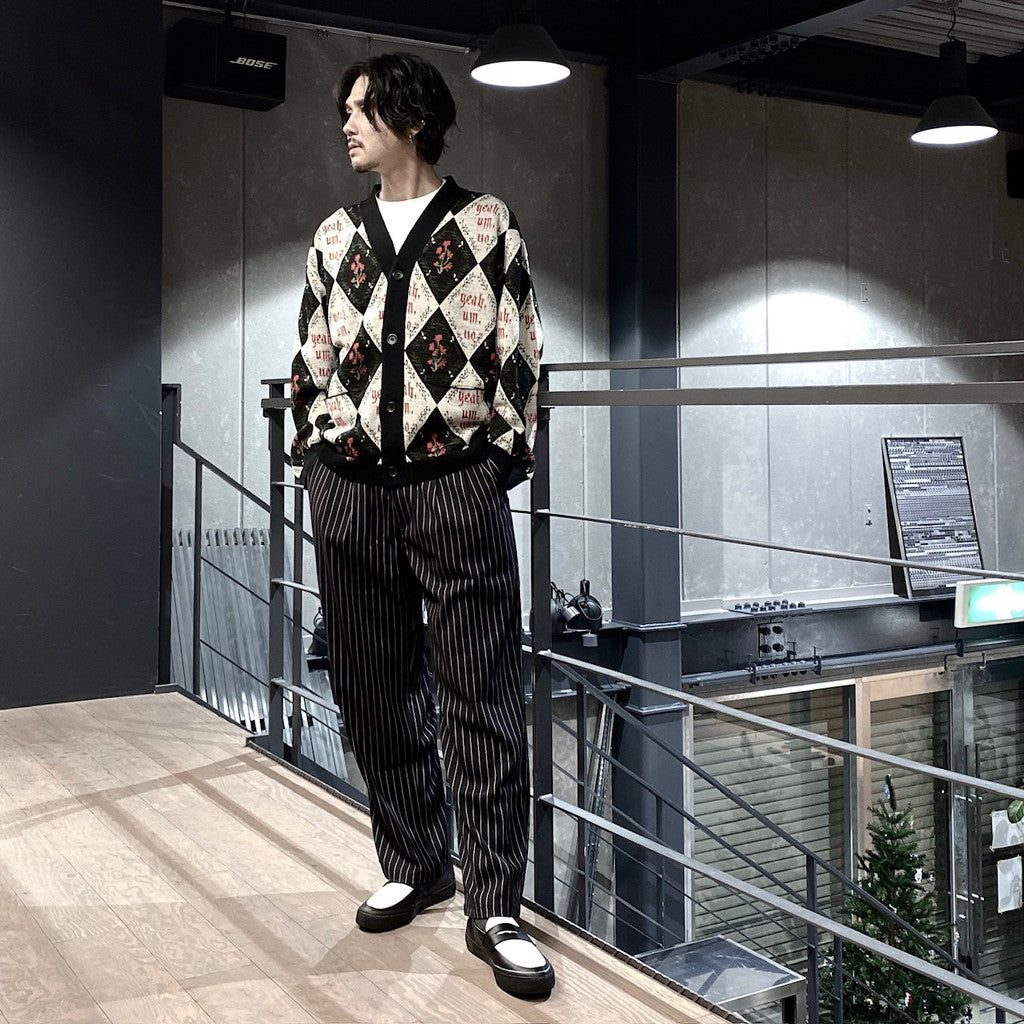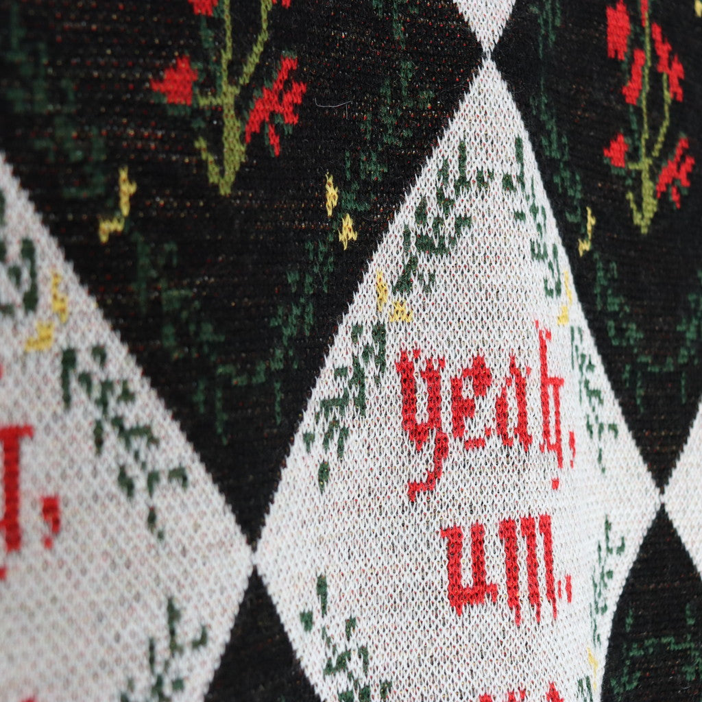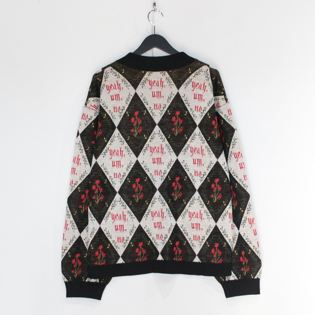 「Yeah,um,no」のメッセージを全体にレイアウトしたジャガードカーディガン。
