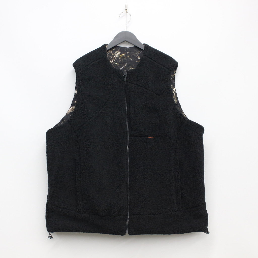ブランドロゴ入りの弾丸が落とし込まれたオリジナルツリーカモ柄のリバーシブルベスト。