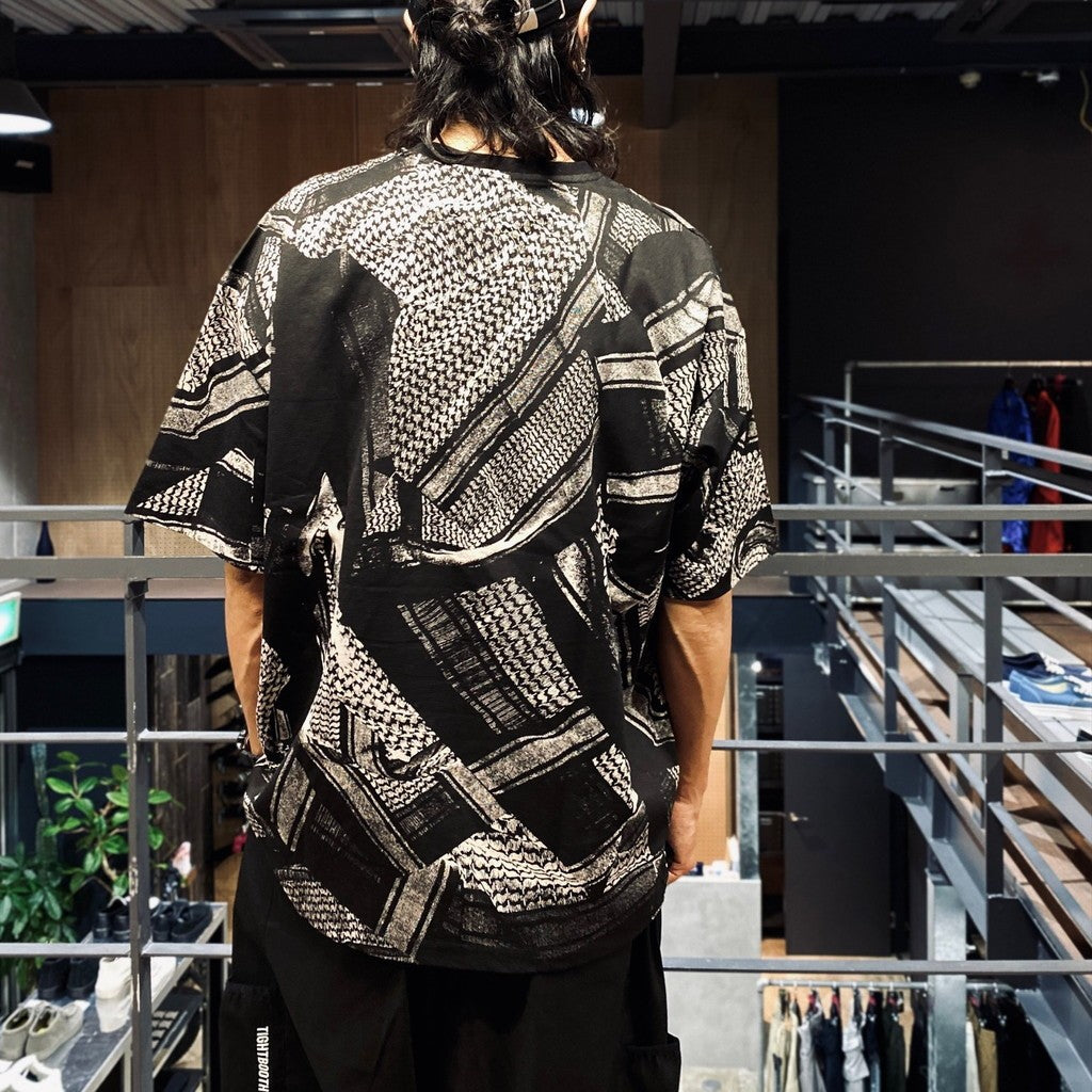 中東などでよく見られるスカーフ、シュマグの柄をアレンジした総柄プリントTシャツ。
