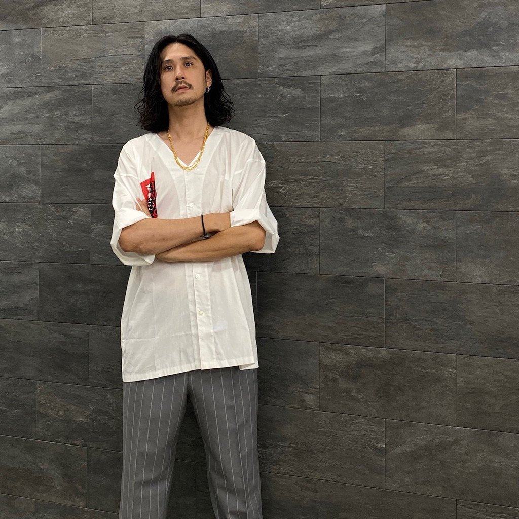 こちらはWACKO MARIAからリリースされている和服のダボシャツをベースに、BEPのアイコンであるステッカーロゴや両ブランドの漢字ロゴがプリントされています。