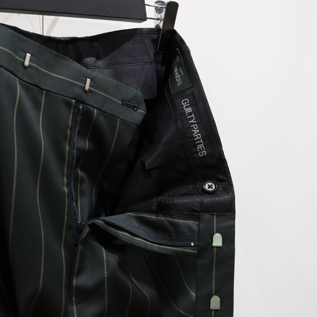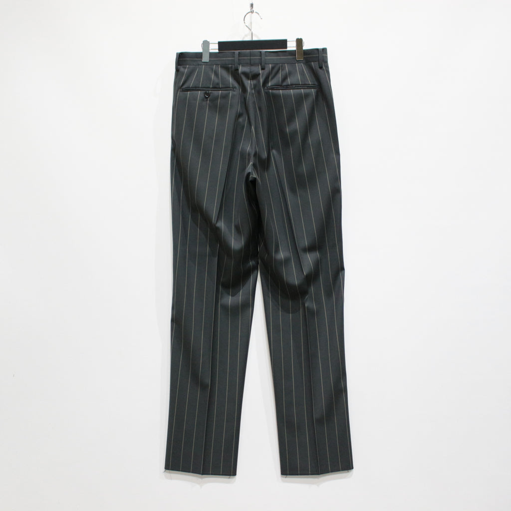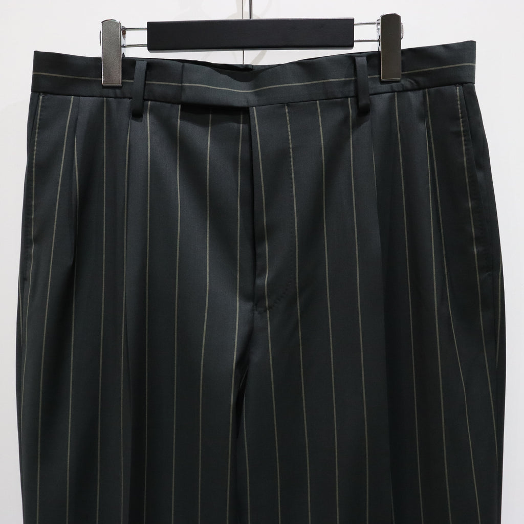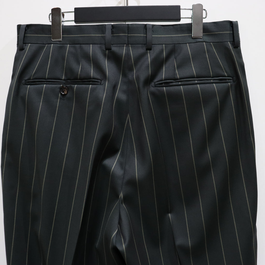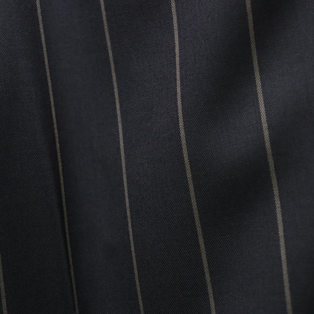 生地の特徴 - 暗めのダークカーキに薄茶色のピンストライプ。オールシーズン着用可能。