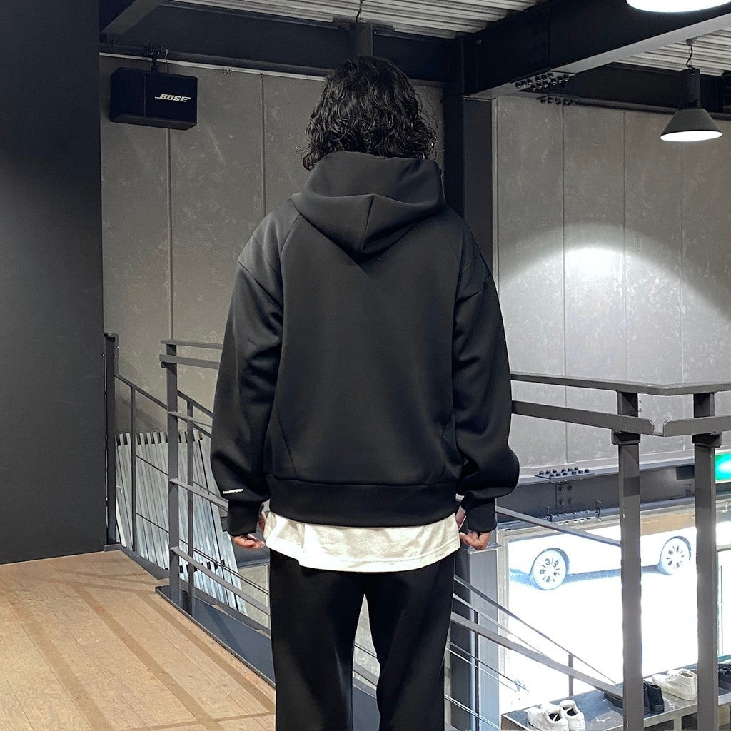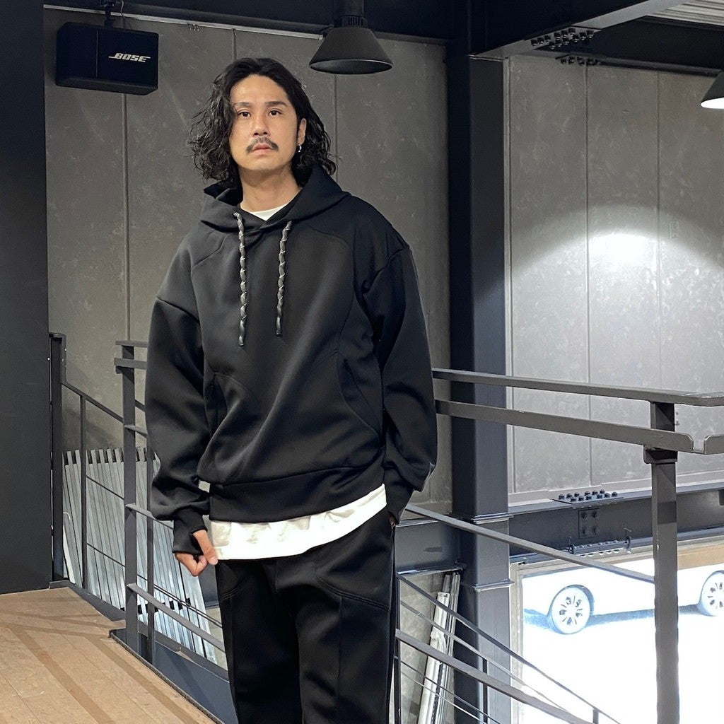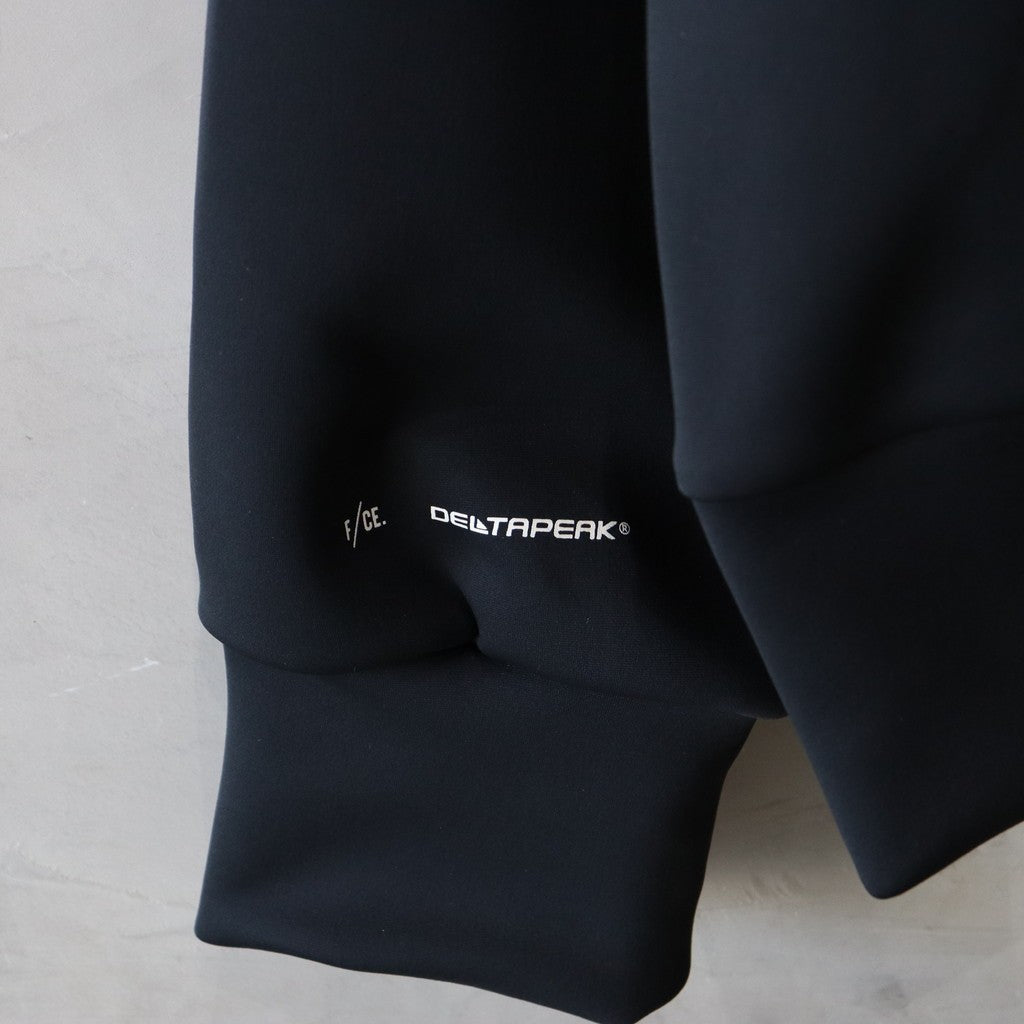 通常のスウェットにはないサラッとした肌触りと肉厚で弾力性のある軽量テック素材。