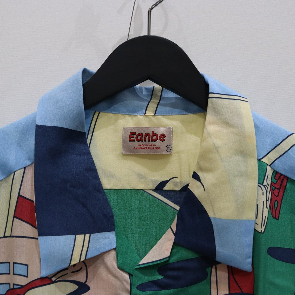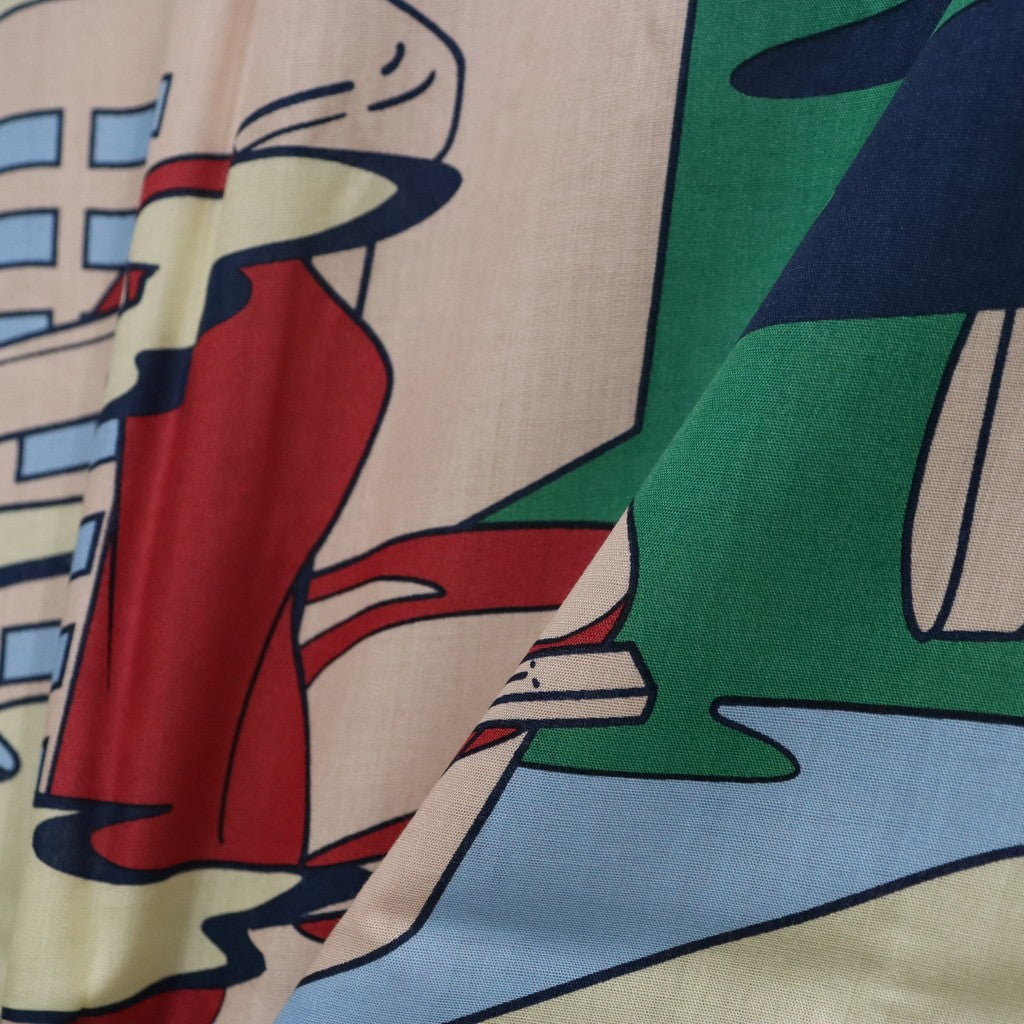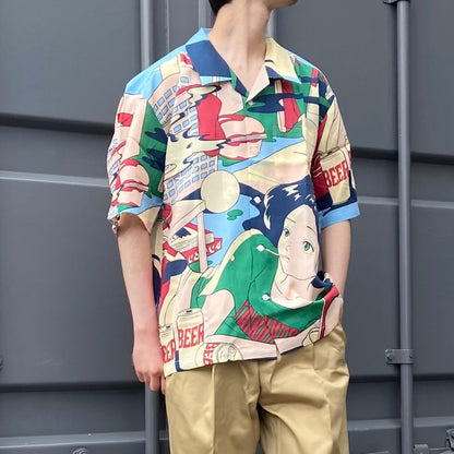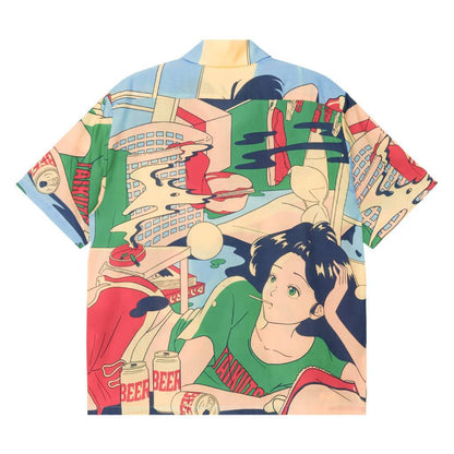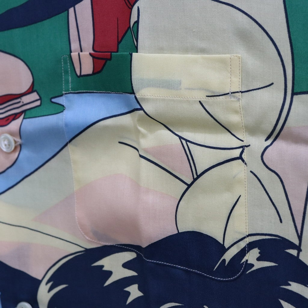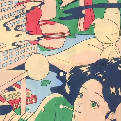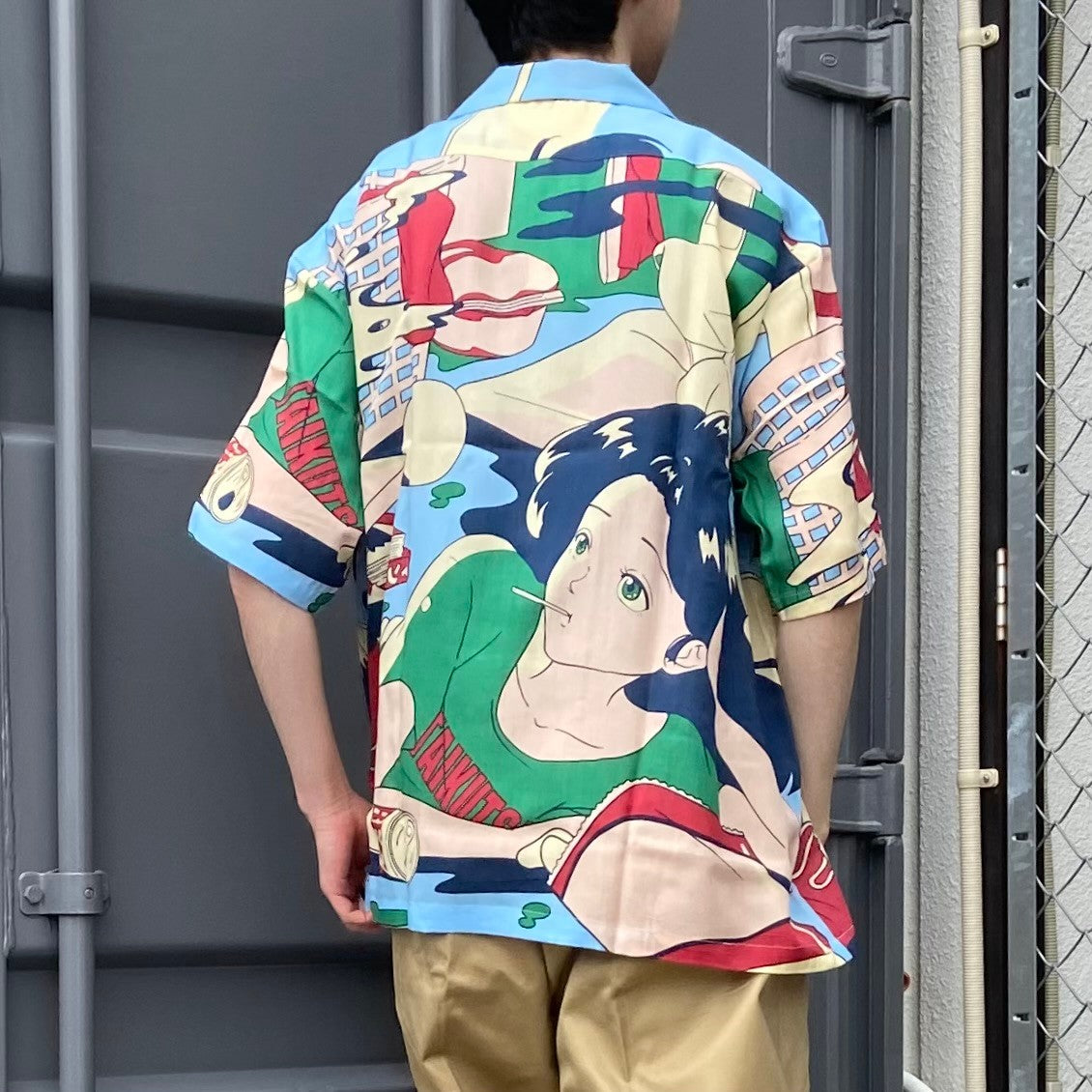 上京し、都会の生活に疲れて「干物女子」と化した主人公を、90年代シティポップ風のレトロなタッチで描いた総柄のアロハシャツ。