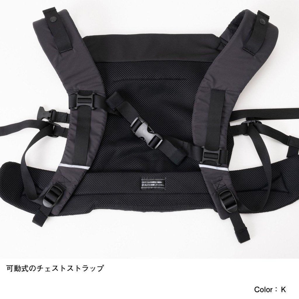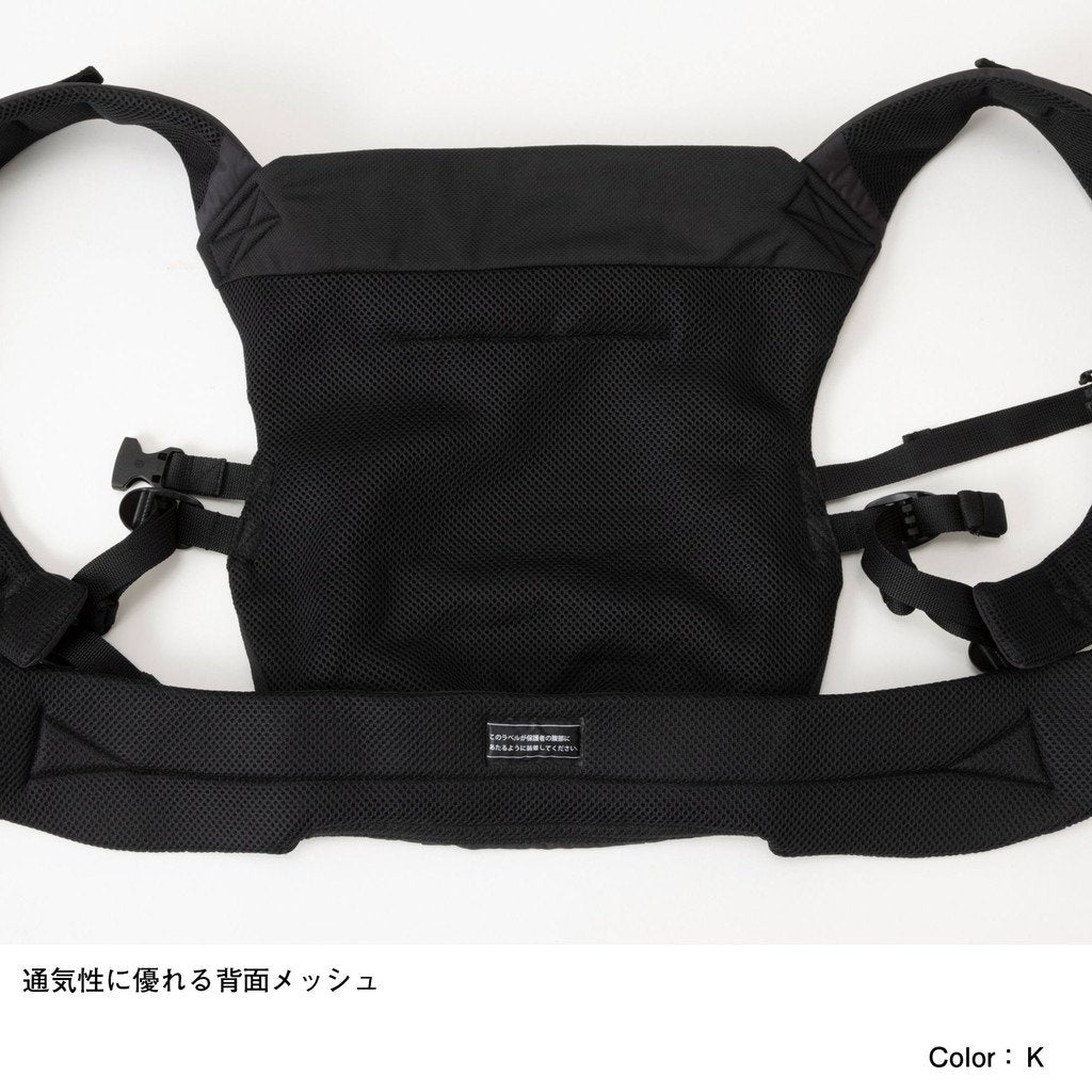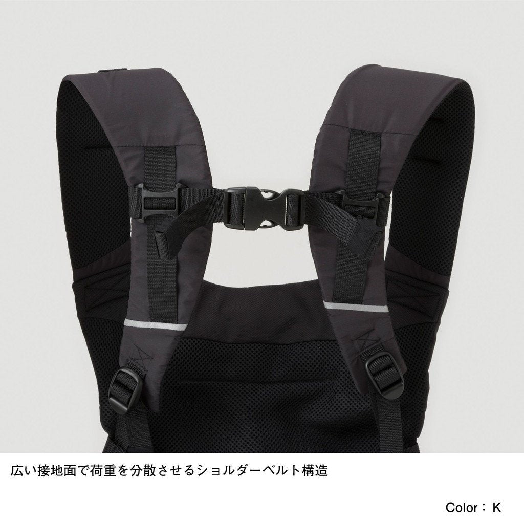 透氣性優異的網狀背部 / 分散負荷的肩帶結構 / 通風 / 帶遮陽罩的內置口袋 / 防水材料 / 反光板 / 附有可用作洗衣網的收納袋 / 2路規格用於背部或手臂/ NNB71901 可與BABY SHELL BLANKET 連接