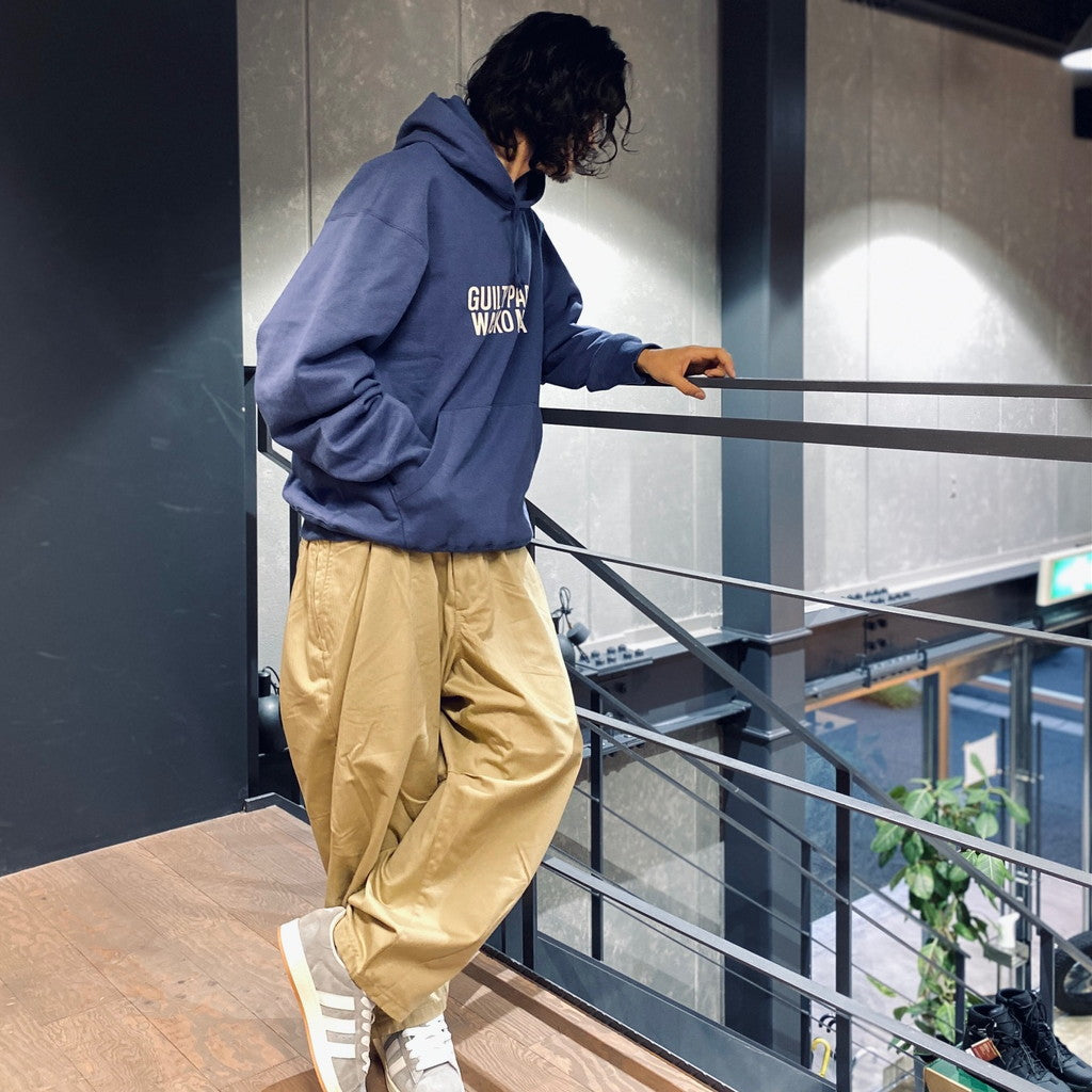 以 BAGGY SLACKS 為基礎的燈籠褲,下擺較窄,膝蓋處有省道,增加尺寸和空間。