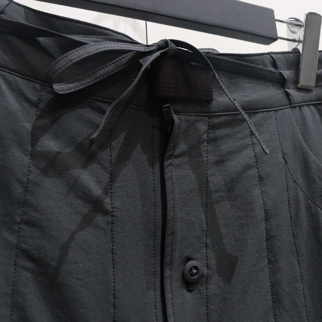 輕盈的聚酯纖維布料。腰部採用拉鍊、抽繩以及前後紐帶設計,方便調整腰身。