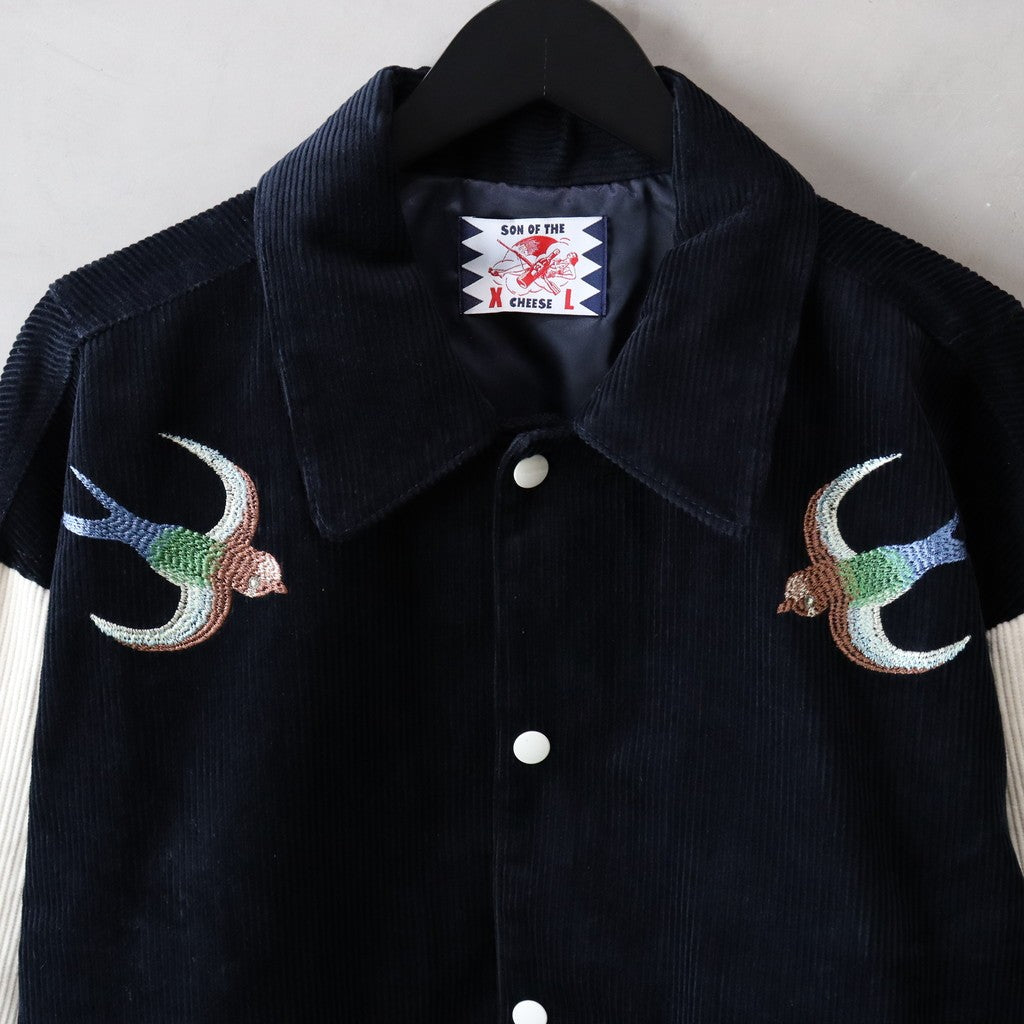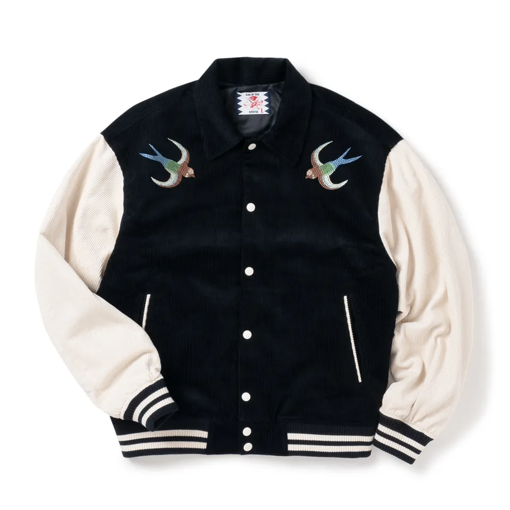 這款童趣十足的棒球夾克,透過布料的運用,呈現出優雅成熟的質感;而藝術化的刺繡,則賦予它一種既親切又略帶頑皮的氣質,使其成為 SON OF THE CHEESE 的典型單品。